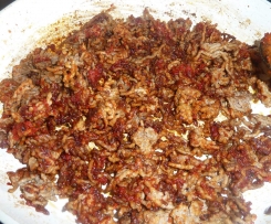 Hackfleisch in einer beschichteten Pfanne, ohne Zugabe von Fett scharf von allen Seiten anbraten. Kurz vor Ende, dasTomatenmark und 1 EL Brühpulver über dem Fleisch verteilen und etwas karamellisieren...
