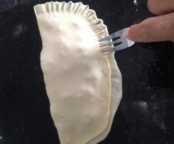 Mit der anderen Hälfte bedecken und die Ränder mit einer Gabel gut zudrücken, so das später kein Saft rauslaufen kann.