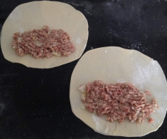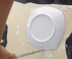 Teig in 4 Teile teilen und jedes Teil auf einer bemehlten Arbeitsfläche dünn ausrollen, mit hilfe eines kleines Tellers (ca.20 cm durchmesser) ausschneiden. (die Teigreste,vom Zuschneiden, behalte ich knete später zusammen und wiederhole mit den Resten den etsten Schritt. So bekommt man möhlichst viele Chebureki raus.