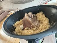 Ich hatte allerding frischen Sauerkraut - da er länger zum Garen braucht wie der aus der Dose habe ich Diesen gleich von Anfang an mit dem Eisbein gegart.
