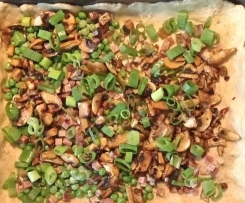 Den mageren Speck in einer Pfanne auslassen und die Champignons mit anbraten. Alle Zutaten gleichmäßig auf dem Teigboden verteilen.