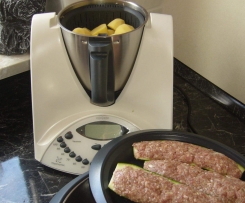 Zucchinis mit dem Hackfleisch füllen und in dem Varoma+ Einlegeboden verteilen.