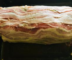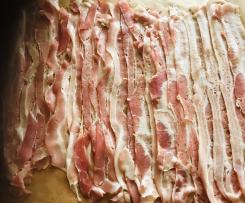 20 Min./Varoma/Stufe 1 stocken lassen. - In der Zwischenzeit Backpapier (Zuschnitte) auslegen und den Bacon dicht, überlappend im Rechteck auslegen.