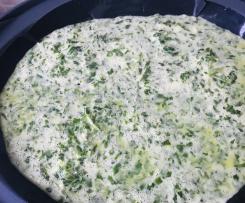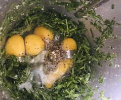 zerkleinern. - 5 Eier, 1 Prise Salz, 3 Prisen Pfeffer und Muskatnuss hinzugeben.