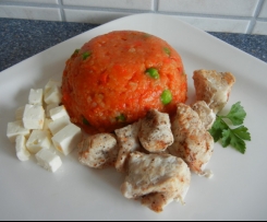 Reis abschmecken und mit Fleisch und Hirtenkäse anrichten.