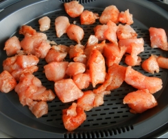 Hähnchenbrustfilet würfeln, mit Salz, Pfeffer und Paprika würzen und in den Varoma-Einlegeboden legen. Dann Varoma beiseite stellen.