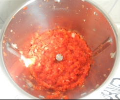 Zwiebeln, Knoblauch und Paprika in den Mixtopf geben und 8 Sek./Stufe 5 zerkleinern.