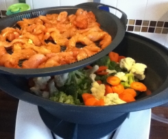 Gemüse putzen und in den Varoma geben. Varomaeinlegeboden einhängen, Fleisch darauf verteilen. Varoma aufsetzen und alles zusammen 28 Min./Varoma/Stufe 1 garen.