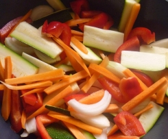 Das Gemüse in dieser Zeit in passend große Stücke schneiden und in den unteren Varmomaboden geben. Darauf achten, dass Gemüse das länger gart feiner geschnitten ist als Gemüse, das schnell gart.