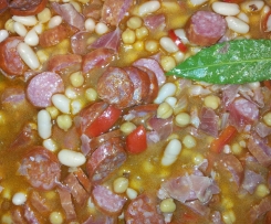 Ich habe das Rezept etwas abgewandelt: Die Bohnenmenge wurde halbiert und statt dessen mit Kichererbsen aufgefüllt. Von der Chorizzo habe ich ebenfalls nur die Hälfe genommen und die andere Hälfte durch Mettwürstchen ersetzt. Ausserdem gebe ich immer noch gem. Kümmel hinzu (beugt Bauchschmerzen vor). Mit Salz bin ich hier extrem vorsichtig, weil die ganzen Räucherwaren schon sehr salzig sind!