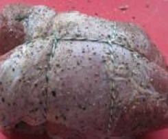 Fleisch zusammenrollen und mit Bindegarn zu einem Rollbraten binden (siehe Bild)