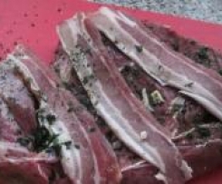 Fleisch waschen, und je nach Fleischstück entweder flach auseinander drücken oder quer einschneiden, salzen und pfeffern. Senf daraufstreichen, Kräuter darauf verteilen und 3 Scheiben durchw. Speck darüberlegen, wer mag, kann in Scheibchen geschnittene Knoblauchzehe darauf verteilen.