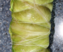 " Modus „Teig kneten“" .Vom Hackfleisch kleine Bällchen entnehmen und in je ein Blatt Kraut das Hackfleisch einrollen. Die Roulade mit Zwirn umwickeln. Die Krautrouladen in den Varoma legen.