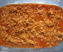 In der Zwischenzeit eine Auflaufform (meine ist 34 x 22 cm groß) einfetten und die Bolognese darin verteilen. Der
