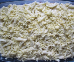 Die Nudeln samt Käsesoße in die Auflaufform über die Bolognese verteilen und mit dem restlichen Käse bestreuen.