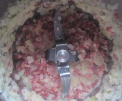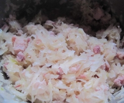 Das Sauerkraut und die Fleischwürfel in den