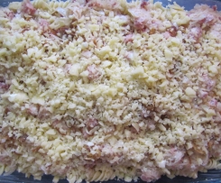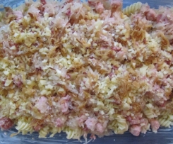 Nudeln, Sauerkrautmasse und Käse abwechselnd in die Auflaufform schichten. Ich habe noch einige Röstzwiebeln mit dazwischen gelegt.