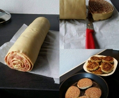 Aufrollen. In ca. 2 cm dicke Scheiben schneiden und braun ausbacken. Ergibt ca. 15 Scheiben.