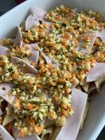 Ein Drittel der Nudeln in die Auflaufform geben und die Hälfte des gekochten Schinken und der zerkleinerten Möhren auf den Nudeln verteilen.