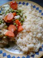 - Hähnchenfleisch mit Salz und Pfeffer würzen. Mit Karotte, Frühlingszwiebeln und Erbsen in den Varoma geben. Dabei einige Lüftungsschlitze frei lassen. Varoma verschließen und beiseite stellen.