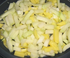 Kartoffeln und Kohlrabi schälen , in Mundgerechte Stücke schneiden und in den Varomaeinlegebogen geben.