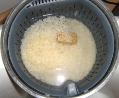 Reis im Gareinsatz einwiegen Brühwürfel rein und das Wasser zufügen.