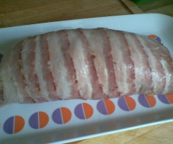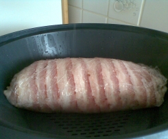 auf einer hitzebeständigen folie den bacon dicht nebeneinander legen, den noch nicht gerollt braten darauf legen und mit der folie gut und stramm einwickeln!!!