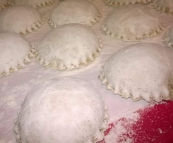 Mit einem EL nun im Abstand von ca. 2cm die Ricotta-Füllung auf einem der Teige verteilen (dabei die jeweils aufeinander zu liegenden Seiten mit den Fingern von überschüssigem Mehl befreien), dann die 2te Teigplatte darauflegen und die Zwischenränder fest andrücken.
