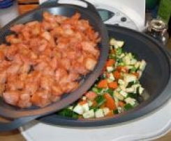 Geschmacklich total lecker. Leider war bei mir der Reis nach der angegebenen Zeit nicht gar. Habe Fleisch, Gemüse und Soße in eine Thermoschüssel verfrachtet und den Reis nachgegart. Hat gut geklappt. Also wer wie ich Naturreis hernimmt, mindestens 10 Minuten garen und dann erst den Varoma aufsetzen!