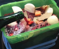 "Mixtopf geschlossen" geben, 5 Sekunden Stufe 5 zerkleinern und mit dem Spatel nach unten schieben. 30 g Olivenöl dazu geben und 3 Minuten , Varoma, Stufe 2 andünsten. Die Rotweinmarinade durch ein Sieb schütten und auffangen. 500 g der Marinierflüssigkeit in den