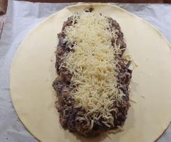 4 Min./100°C/Stufe 3 verrühren, auch zum Hackfleisch geben und gut vermengen. - 6. Ein Backblech mit Backpapier auslegen, Blätterteig darauf ausrollen, die Füllung in einem ca. 10 cm breiten Streifen in der Mitte ausbreiten. Mit 100g Käse bedecken. Zuerst Teig unten und oben dann rechts und links über die Füllung klappen.