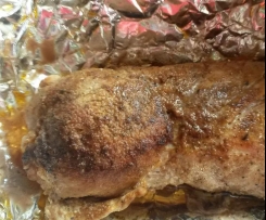 Sofort in die bereitgelegte Alufolie - BITTE mit der GLÄNZENDEN Seite ZUM FLEISCH - dicht einpacken. Die glänzende Seite nach Außen würde bedeuten, dass die Hitze abgewehrt würde!