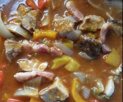 Soße nach Ende der Kochzeit abschmecken. Da wir keine grüne Paprika möge und verarbeiten, ist uns die Soße süß genug. Evtl. mögen Sie persönlich es aber süßer und vor allem schärfer.