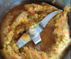 Paprika-Hälften nochmals vierteln, ebenso die Zwiebel, Gewürzgurken hinzu und 5 sec / Stufe 5 zerkleinern.