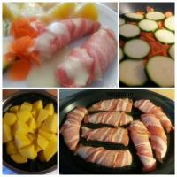 - Das Schweinefilet in 2 cm. dicke Stücke schneiden. Mit Salz und Pfeffer auf beiden Seiten würzen. Das Schweinefilet mit dem Speck an der Außenseite umwickeln. Das Ganze in den Varomaeinlegeboden legen.
