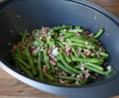 - Die Bohnen waschen, die Enden abschneiden und in den Varoma geben. Die Zwiebel in den Mixtopf geben und 3 Sek./Stufe 5 zerkleinern. Zwiebeln und Speckwürfel zu den Bohnen geben. Mit Salz und Pfeffer würzen und alles mit den Händen durchmengen.