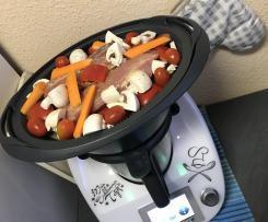 "Mixtopf geschlossen" geben. Den Garkorb einhängen und die Kartoffeln hinzugeben. - 2. Schw. Filet mit 2 Prisen Salz & Pfeffer würzen und das Filet gleichmäßig mit 2 TL Senf einreiben und in den Veroma legen. Champignons, Möhren, Kirschtomaten & Paprika neben dem Filet und in Einlageboden verteilen.