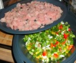 Rote und gelbe Paprika, Zucchini und Frühlingszwiebeln in mundgerechten Stücken in den Varoma legen und die dünnen Streifen Hähnchenbrustfilet auf dem Einlegeboden des Varoma verteilen.