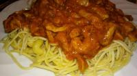 Pfanne mit 1 Kaffeebecher voll Ananassaft abgelöscht. 2 sehr geh. TL Curry. Hatte nur 200 g Chilisoße (als Ersatz: 30 g Tomatenmark, 70 g Wasser), 40 g Sojasoße, 2 TL Worcestersoße, 200 g Sahne. Extra dünne Spaghetti dazu. Tolle Würze, leichte Schärfe "im Abgang"