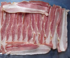 - In der Zwischenzeit eine Auflaufform (meine ist 34 x 23 cm) mit den Schinkenspeckscheiben auslegen. Die Form sollte so groß sein, dass die Schnitzel später nebeneinander darin liegen können.