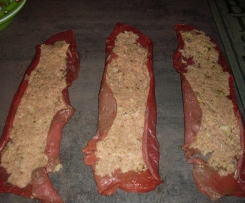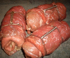 Die Füllung auf die 4 Rouladen verteilen, die Seiten einschlagen (Füllung kann somit nicht mehr ausfallen) und zu Rouladen aufrollen ( mit Rouladenklammern, Zwirn, Netz fixieren)