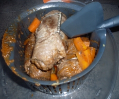 120g Gemüse (je 40g Möhren,Sellerie,Porree) in Stücken ,20g Tomatenmark,20g Senf und den Bratensaft aus der Pfanne mit 250g Rotwein (oder roten Traubensaft) und 1 Würfel Fleischbrühe (oder selbstgemachte Fleischbrühpaste) zugeben und Garkörbchen einsetzen