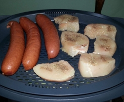 4. Nach belieben Mettwürstchen und/oder Putensteaks in den Varoma Einlegeboden geben. Kommt darauf an was Ihr lieber mögt.