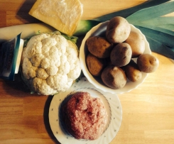 In der Zwischenzeit die Kartoffeln pellen und in Scheiben schneiden.Wir legen die Scheiben nun in eine gefettete Auflaufform und bedecken sie anschließend mit der Fleisch-Käsemischung. Nun wird der Blumenkohl und der Lauch drauf verteilt.