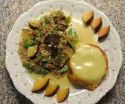 Auf Tellern anrichten und servieren. Dazu paßt Geflügel, kurz gebraten oder überbacken.