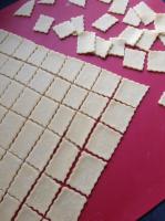 In der Zwischenzeit einen größeren Topf mit Salzwasser zum Kochen bringen. Dann von dem Teig kleine Fleckerl in das sprudelnd kochende Wasser einzupfen. Man kann den Teig auch dünn ausrollen und mit einem Teigrädchen gleichmäßige Rauten schneiden. Ich zupfe es aber ganz ungleichmäßig - wie es meine liebe Schwiegermutter gemacht hat.