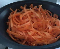 Die Möhren schälen, mit dem Sparschäler in dünne Streifen hobeln und in den Varoma geben.
