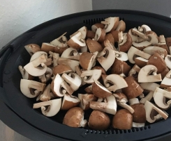 Die Champignons putzen, vierteln oder in Scheiben schneiden (je nach Größe) und auf dem Varomaeinlegeboden verteilen.