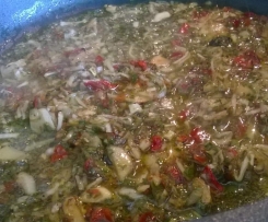 Während der Kochzeit die Gewürzmischung Puttanesca in 3 EL Wasser einweichen, zwischendurch umrühren und zum Schluß 1 ELOlivenöl unterrühren.