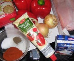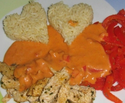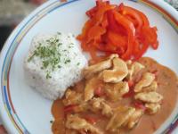 Reis und Paprika warm stellen, für die Soße die Flüssigkeit im Topf auf 500 g auffüllen oder verringern und kurz zur Seite stellen. Nun Butter, Zwiebeln und Paprikawürfel kurz anschwitzen -> 2 Min / 100° / Stufe 1. Sahne, Mehl, Tomatenmark, Salz, Pfeffer und Paprikapulver zugeben 5 Sek / St. 4 durchmixen und dann 5 Min / 100° / Stufe 3 aufkochen lassen.